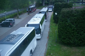 06.37 am All the buses lined up for our escape from the Golden Tulip hotel to Rhineland.